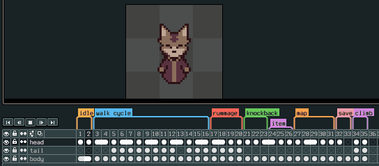 i edit all the sprites for the game in aseprite. the most complicated set of sprites ive had to create are for the main character, and editing them in aseprite helps keep the layered sprite sheets organized and quick to iterate on.