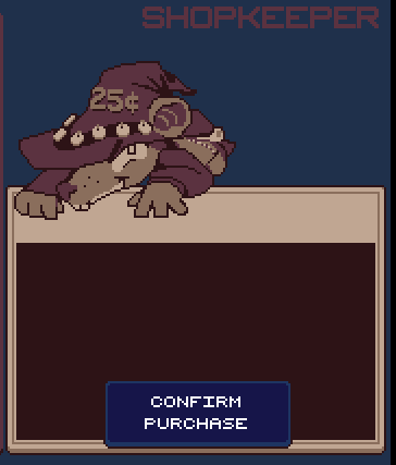 some pretty rough progress was made on the shopkeeper UI as well. i might scrap the coin visual for something more clear. a lot of the time in development i'm just stumbling around trying out new things i havent seen in many games before learning why things are done differently. usually, most games have it right and get the clunkiness and confusion-inducing elements of UI down to a minimum.