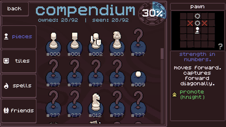 ive also been working on some ui elements for the shop. i think having the piece sprites and piece cards visible in the shop menu is important. with both sprites shown to the player before they purchase, an association is built between the piece and the card, despite their vastly different visual designs.
